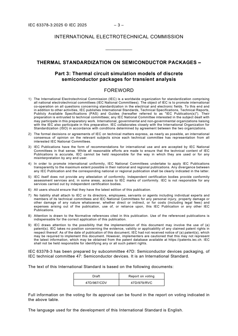 IEC 63378-3:2025 is a standard published by the International Electrotechnical Commission (IEC). Its full title is "Thermal standardization on semiconductor packages - Part 3: Thermal circuit simulation models of discrete semiconductor packages for transient analysis". This standard covers: IEC 63378-3:2025 specifies the thermal circuit network model of discrete (TO‑243, TO‑252 and TO‑263) packages, which is used in the transient analysis of electronic devices to estimate precise junction temperatures without experimental verification. This model is intended to be made and provided by semiconductor suppliers and to be used by assembly makers of electronic devices.
