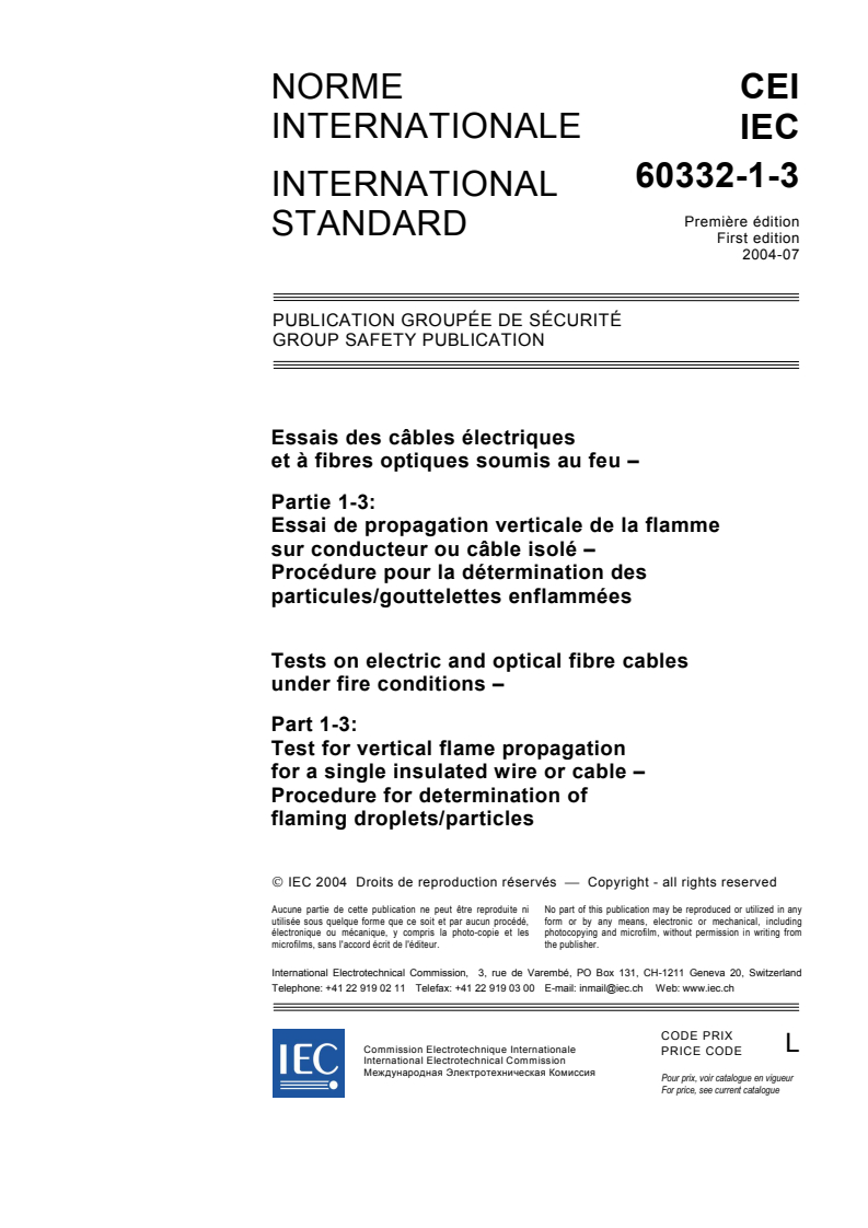 IEC 60332-1-3:2004 is a standard published by the International Electrotechnical Commission (IEC). Its full title is "Tests on electric and optical fibre cables under fire conditions - Part 1-3: Test for vertical flame propagation for a single insulated wire or cable - Procedure for determination of flaming droplets/particles". This standard covers: IEC 60332-1-3:2004 Specifies a test procedure for assessment of falling flaming droplets/ particles when a single vertical electrical insulated conductor or cable, or optical fibre cable, is subjected to defined fire conditions. NOTE - Testing to IEC 60332-1-3 may be performed simultaneously with that to IEC 60332-1-2, if required. Recommended requirements for performance are given in Annex A. IEC 60332-1-3 specifies the use of a 1 kW pre-mixed flame and is for general use, except that the procedure specified may not be suitable for the testing of small single insulated conductors or cables of less than 0,5 mm2 total cross-section because the conductor melts before the test is completed, or for the testing of small optical fibre cables because the cable is broken before the test is completed.