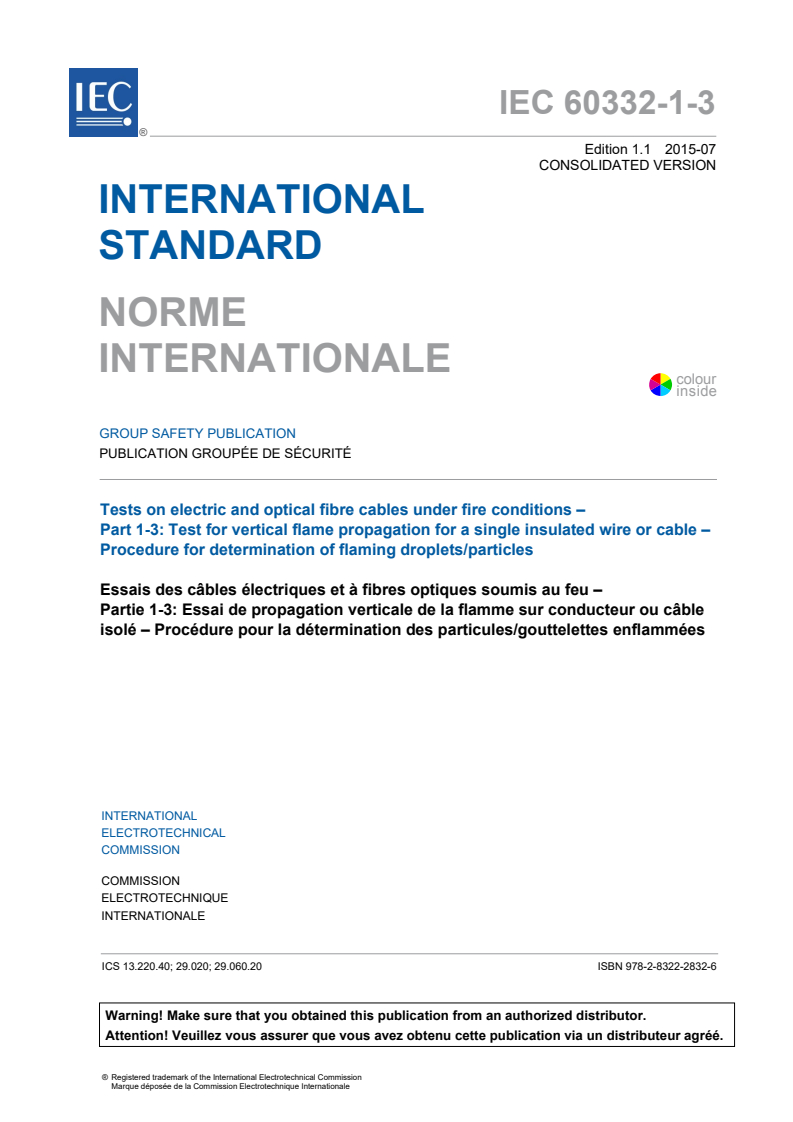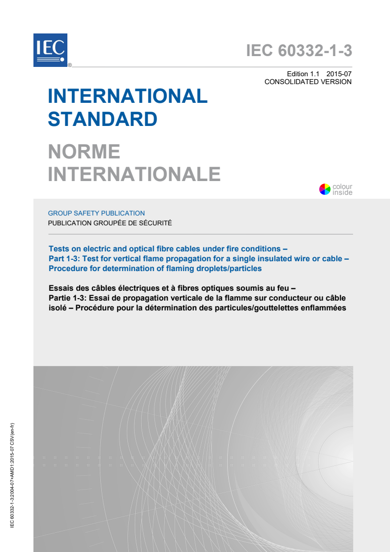 IEC 60332-1-3:2004+AMD1:2015 CSV - Tests on electric and optical fibre cables under fire conditions - Part 1-3: Test for vertical flame propagation for a single insulatedwire or cable - Procedure for determination of flamingdroplets/particles Released:7/28/2015