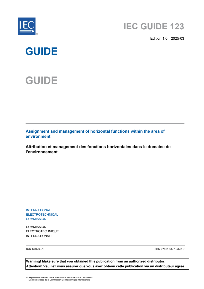 IEC GUIDE 123:2025 is a guide published by the International Electrotechnical Commission (IEC). Its full title is "Assignment and management of horizontal functions within the aspect environment". This standard covers: IEC GUIDE 123:2025 defines provisions for the implementation of IEC Guide 108 by ACEA and IEC committees within the area of environment. It defines procedures for IEC committees to request the assignment of horizontal functions within the area of environment, giving the committee authority to develop one or more environment horizontal publications within the assigned horizontal function, as well as to manage the environment horizontal publications developed under the assigned horizontal function, and ACEA on how to assess and recommend (to the SMB) the assignment of horizontal functions within the area of environment to a committee, and to manage and supervise assigned environment horizontal functions and the respective environment horizontal publications and their correct application by product committees. This Guide also describes the respective responsibilities of the developers and users of environment horizontal publications in order to ensure that the area of environment is dealt with in a comprehensive and coherent manner by the IEC technical community. This Guide does not cover horizontal functions within the areas of energy efficiency and electromagnetic compatibility (EMC), which are covered by IEC Guide 118 and IEC Guide 107, respectively.