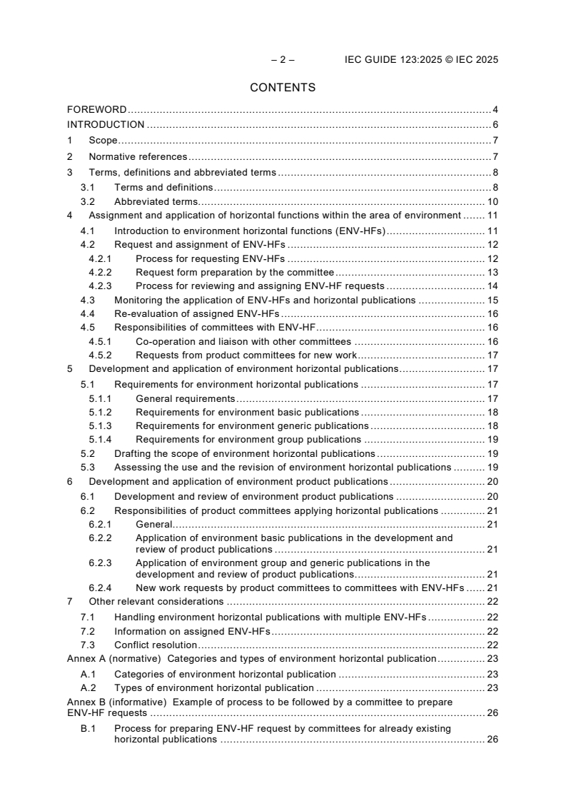 IEC GUIDE 123:2025 defines provisions for the implementation of IEC Guide 108 by ACEA and IEC committees within the area of environment. It defines procedures for IEC committees to request the assignment of horizontal functions within the area of environment, giving the committee authority to develop one or more environment horizontal publications within the assigned horizontal function, as well as to manage the environment horizontal publications developed under the assigned horizontal function, and ACEA on how to assess and recommend (to the SMB) the assignment of horizontal functions within the area of environment to a committee, and to manage and supervise assigned environment horizontal functions and the respective environment horizontal publications and their correct application by product committees. This Guide also describes the respective responsibilities of the developers and users of environment horizontal publications in order to ensure that the area of environment is dealt with in a comprehensive and coherent manner by the IEC technical community. This Guide does not cover horizontal functions within the areas of energy efficiency and electromagnetic compatibility (EMC), which are covered by IEC Guide 118 and IEC Guide 107, respectively.