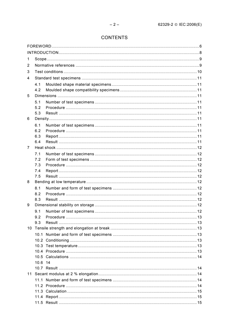 IEC 62329-2:2006 defines the methods of test for heat-shrinkable moulded shapes used for insulation, environmental sealing, mechanical protection and strain relief at connector/cable terminations and multi‑way transitions. The standard provides standardized test procedures and specimen requirements to control the quality and performance of heat‑shrinkable moulded shapes across a range of configurations and materials. It also notes that these tests do not fully determine suitability for specialised processes such as impregnation or encapsulation.
