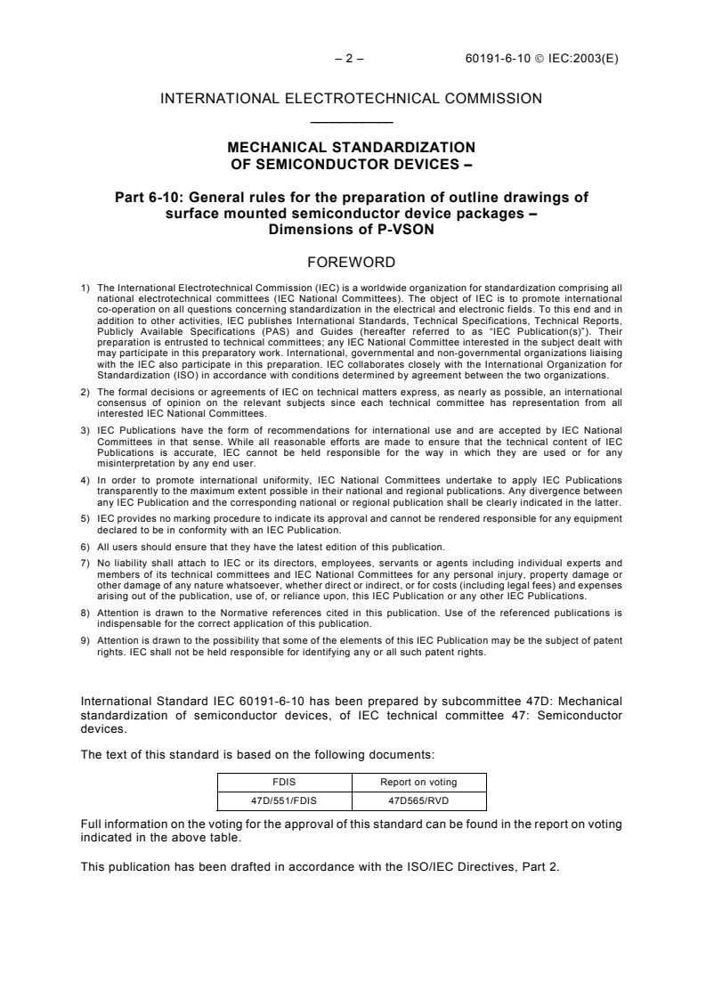 IEC 60191-6-10:2003 provides the common outline drawings and dimensions for all types of structures and composed materials of plastic very thin small outline non-lead package (hereinafter called P-VSON).