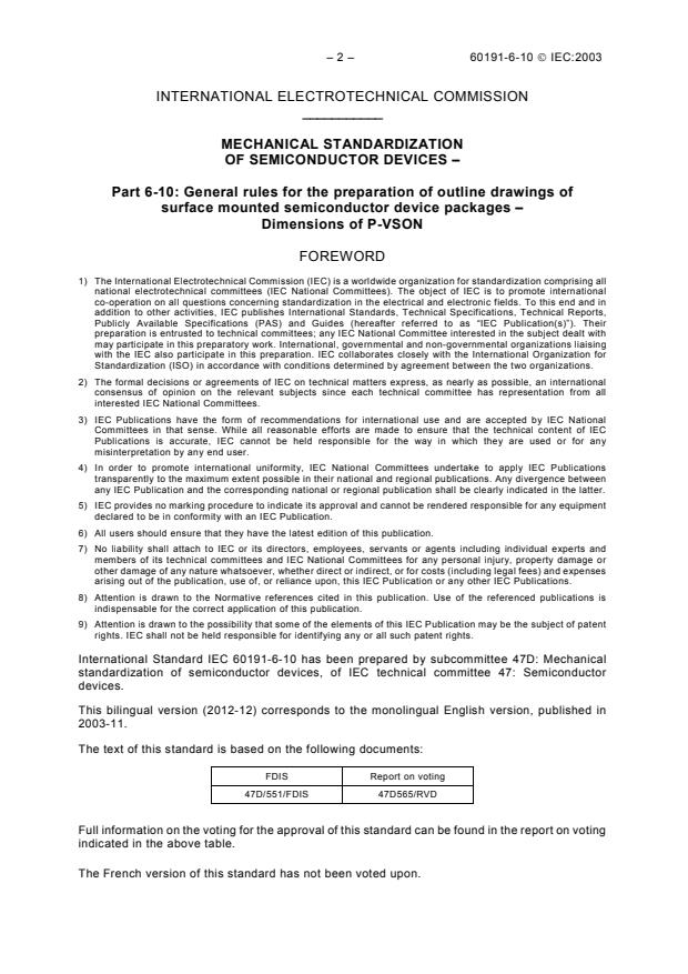IEC 60191-6-10:2003 - Mechanical standardization of semiconductor devices - Part 6-10: General rules for the preparation of outline drawings of surface mounted semiconductor device packages - Dimensions of P-VSON