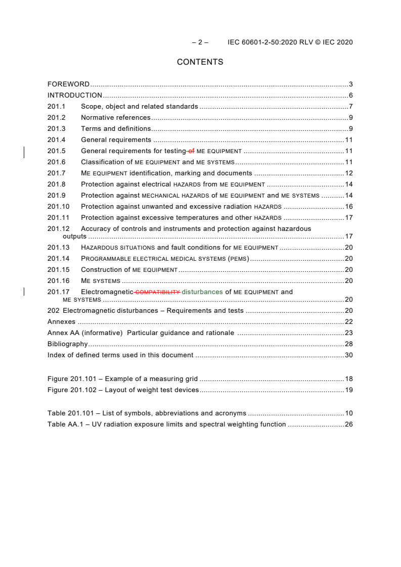 IEC 60601-2-50:2020 applies to the BASIC SAFETY and ESSENTIAL PERFORMANCE of INFANT PHOTOTHERAPY EQUIPMENT, as defined in 201.3.203, also referred to as ME EQUIPMENT. If a clause or subclause is specifically intended to be applicable to ME EQUIPMENT only, or to ME SYSTEMS only, the title and content of that clause or subclause will say so. If that is not the case, the clause or subclause applies both to ME EQUIPMENT and to ME SYSTEMS, as relevant. HAZARDS inherent in the intended physiological function of ME EQUIPMENT or ME SYSTEMS within the scope of this document are not covered by specific requirements in this document, except in 7.2.13 and 8.4.1 of the general standard. IEC 60601-2-50:2020 specifies safety requirements for INFANT PHOTOTHERAPY EQUIPMENT, but alternate methods of compliance with a specific clause by demonstrating equivalent safety will not be judged as non-compliant if the MANUFACTURER has demonstrated in his RISK MANAGEMENT FILE that the RISK presented by the HAZARD has been found to be of an acceptable level when weighed against the benefit of treatment from the device. IEC 60601-2-50:2020 does not apply to: - devices supplying heat via BLANKETS, PADS or MATTRESSES in medical use; for information, see IEC 60601-2-35; - INFANT INCUBATORS; for information, see IEC 60601-2-19; - INFANT TRANSPORT INCUBATORS; for information, see IEC 60601-2-20; - INFANT RADIANT WARMERS; for information, see IEC 60601-2-21. IEC 60601-2-50:2020 cancels and replaces the second edition published in 2009 and Amendment 1:2016. This edition constitutes a technical revision. IEC 60601-2-50:2020 includes the following significant technical change with respect to the previous edition: re-dating of normative references.