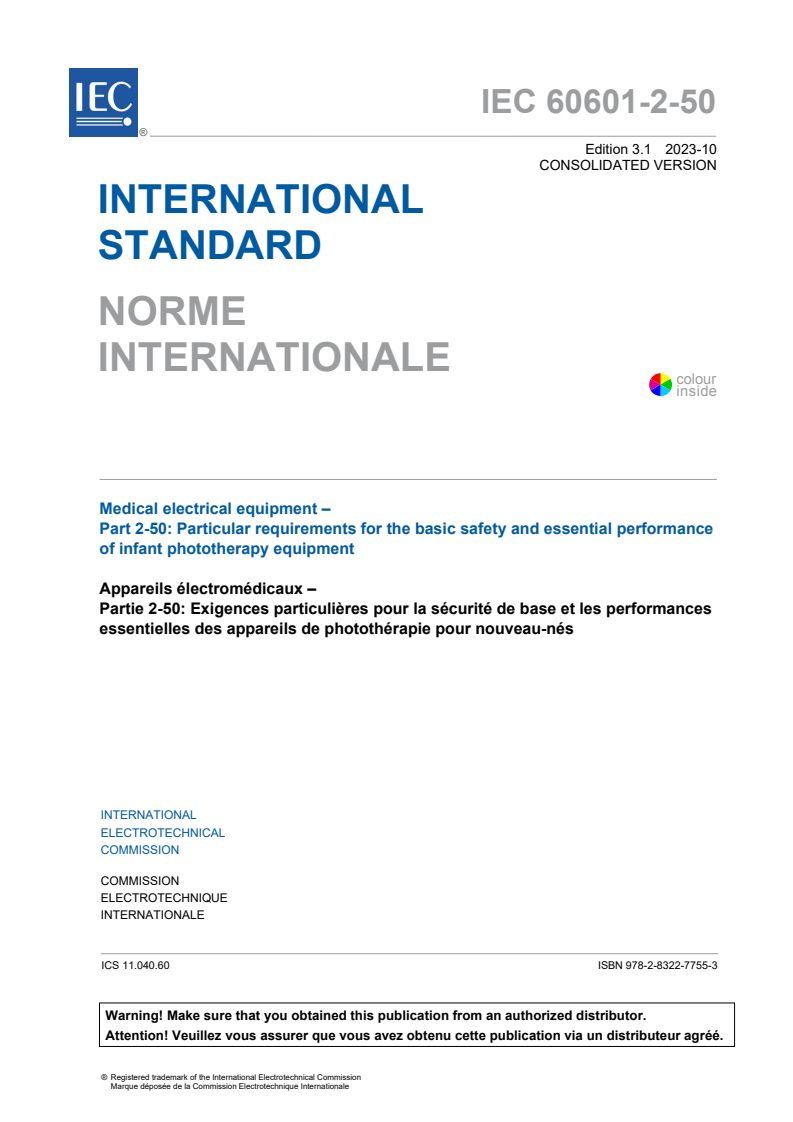 IEC 60601-2-50:2020 is the third edition particular standard in the IEC 60601 series that defines the basic safety and essential performance requirements for infant phototherapy equipment (medical electrical - ME - equipment and ME systems). This edition (2020) cancels and replaces the 2009 edition and Amendment 1:2016 and includes a technical revision (notably re-dating of normative references). The standard supplements the general standard IEC 60601-1 and specifies tests, marking, and documentation required to demonstrate safe operation of phototherapy devices used to treat neonatal jaundice.