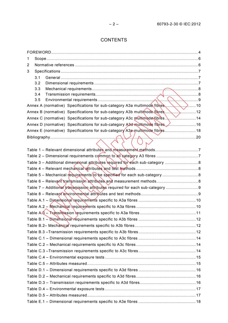 IEC 60793-2-30:2012 is the sectional product specification for category A3 multimode fibres, covering sub‑categories A3a, A3b, A3c, A3d and the newly added A3e (third edition, 2012). The standard defines a three‑tiered requirements model: