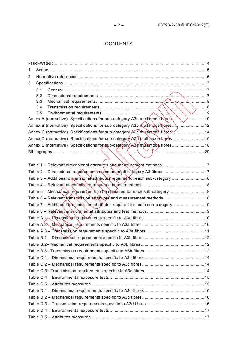 Keywords: A3 multimode fibres, IEC 60793-2-30:2012, sub-categories A3a A3b A3c A3d A3e, core diameter, concentricity error, proof stress, attenuation, modal bandwidth.