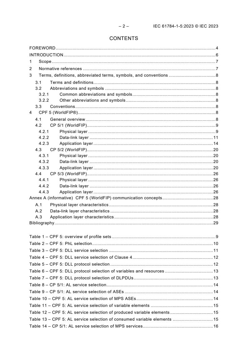 IEC 61784-1-5:2023 defines Communication Profile Family 5 (CPF 5). CPF 5 specifies a set of protocol specific communication profiles (CPs) based on the IEC 61158 series (Type 7) and other standards, to be used in the design of devices involved in communications in factory manufacturing and process control. NOTE All CPs are based on standards or draft standards or International Standards published by the IEC or on standards or International Standards established by other standards bodies or open standards processes. Each CP selects an appropriate consistent and compatible subset of services and protocols from the relevant set that is defined and modelled in the IEC 61158 series. For the selected subset of services and protocols, the profile also describes any possible or necessary constraints in parameter values.