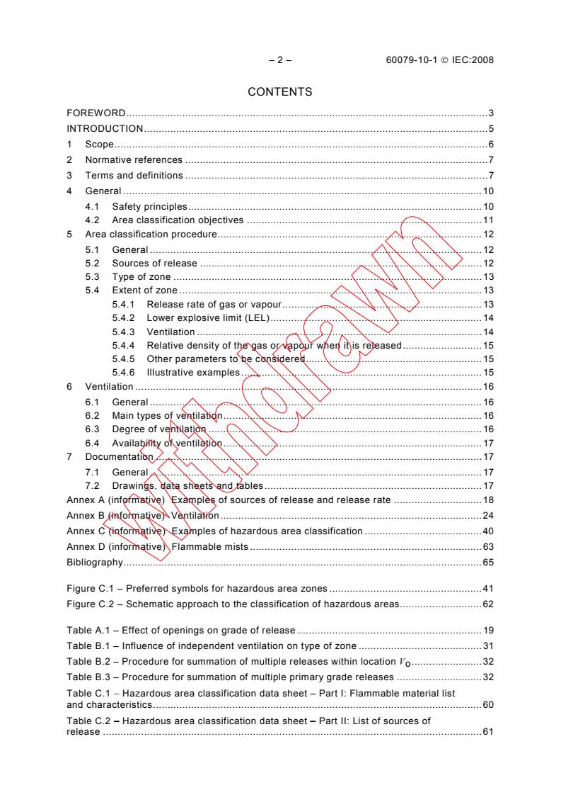 IEC 60079-10-1:2008 is a standard published by the International Electrotechnical Commission (IEC). Its full title is "Explosive atmospheres - Part 10-1: Classification of areas - Explosive gas atmospheres". This standard covers: IEC 60079-10-1:2008 is concerned with the classification of areas where flammable gas or vapour or mist hazards may arise and may then be used as a basis to support the proper selection and installation of equipment for use in a hazardous area. It is intended to be applied where there may be an ignition hazard due to the presence of flammable gas or vapour, mixed with air under normal atmospheric conditions, but it does not apply to a) mines susceptible to firedamp; b) the processing and manufacture of explosives; c) areas where a hazard may arise due to the presence of combustible dusts or fibres; d) catastrophic failures which are beyond the concept of abnormality; e) rommos used for medial purposes; f) domestic premises. This first edition of IEC 60079-10-1 cancels and replaces the fourth edition of IEC 60079-10, published in 2002, and constitutes a technical revision. The significant technical changes with respect to the previous edition are: - introduction of Annex D which deals with explosion hazard from flammable mists generated by the release under pressure of high flash point liquids; - introduction of Clause A.3 (release rate) which gives thermodynamic equations for release rate with a number of examples for estimating release rate of fluids and gases.