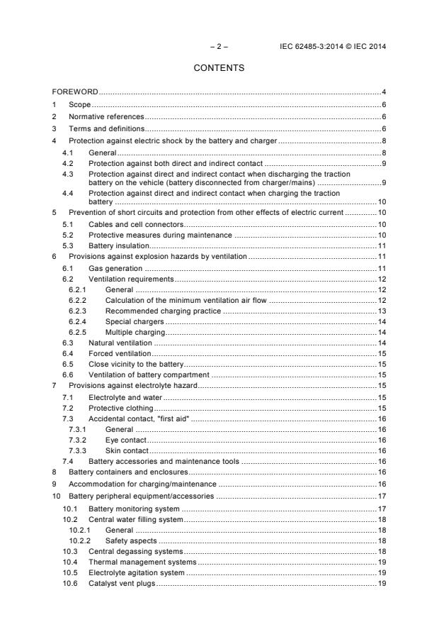 IEC 62485-3:2014 is a standard published by the International Electrotechnical Commission (IEC). Its full title is "Safety requirements for secondary batteries and battery installations - Part 3: Traction batteries". This standard covers: IEC 62485-3:2014 applies to secondary batteries and battery installations used for electric vehicles, e.g. in electric industrial trucks (including lift trucks, tow trucks, cleaning machines, automatic guided vehicles), in battery powered locomotives, in electric vehicles (e.g. goods vehicles, golf carts, bicycles, wheelchairs), and does not cover the design of such vehicles. It provides requirements on safety aspects associated with the installation, use, inspection, maintenance and disposal of batteries. This edition includes the following significant technical changes with respect to the previous edition: a) a comprehensive revision of Clause 6, presenting a unified and changed formula for the calculation of the required ventilation air flow during battery charging; b) addition of requirements for properties of floor material and battery changing equipment in Clause 9.