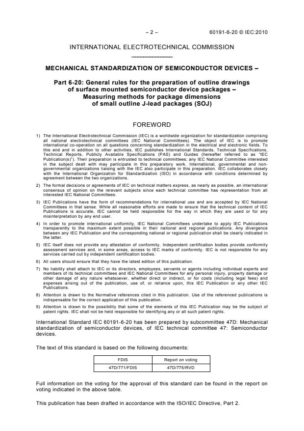 IEC 60191-6-20:2010 specifies methods to measure package dimensions of small outline J-lead-packages (SOJ), package outline form E in accordance with IEC 60191-4.