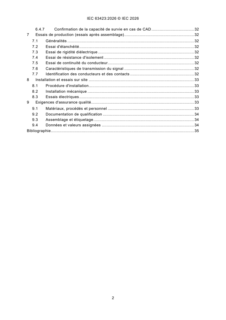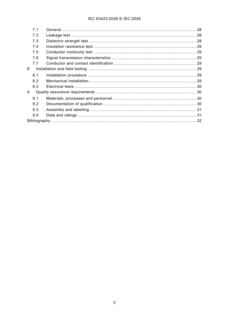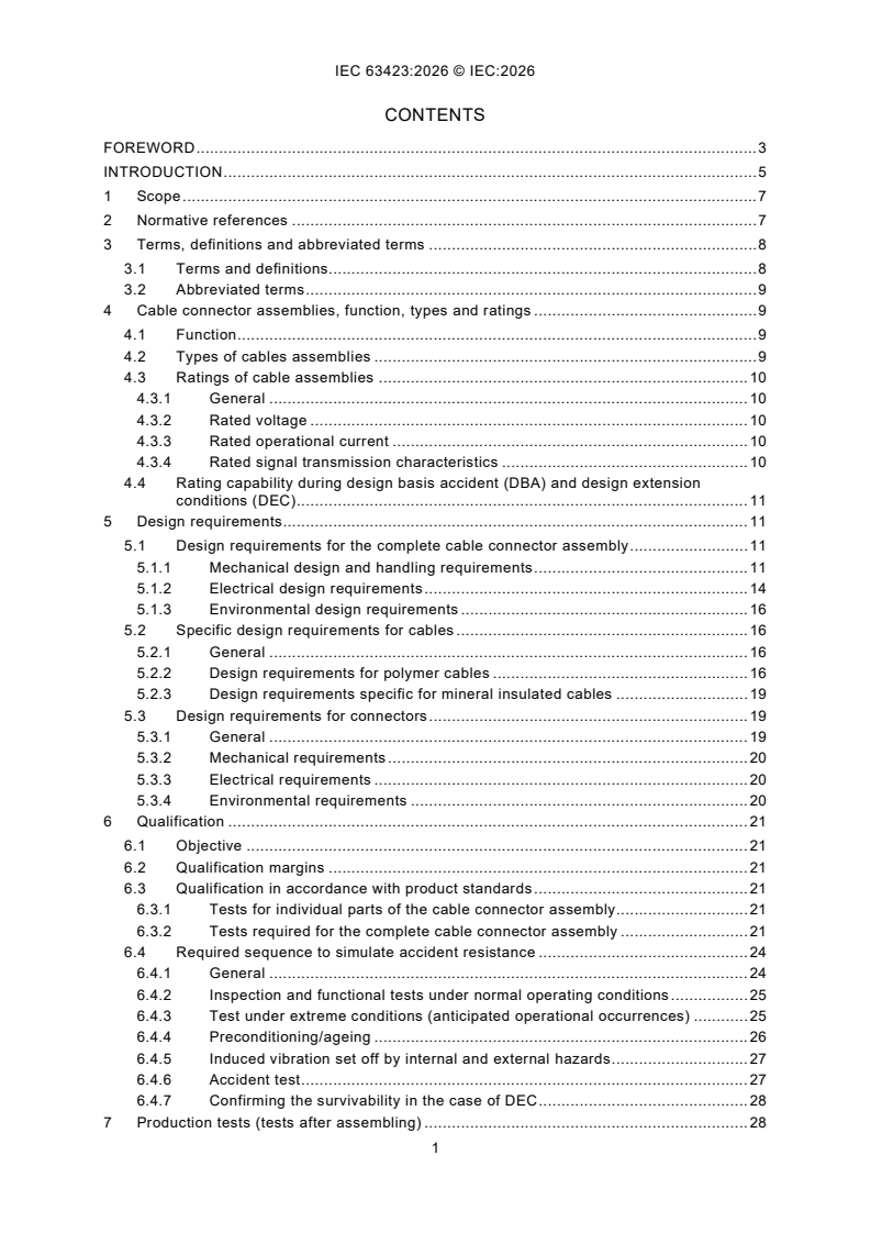 IEC 63423:2026 applies to cable connector assemblies for harsh environment purposes that are important to safety. It covers the engineering safety aspects to be met in the design, qualification, fabrication, assembling, testing, and installation on site of cable connector assemblies to be operated under accident conditions.