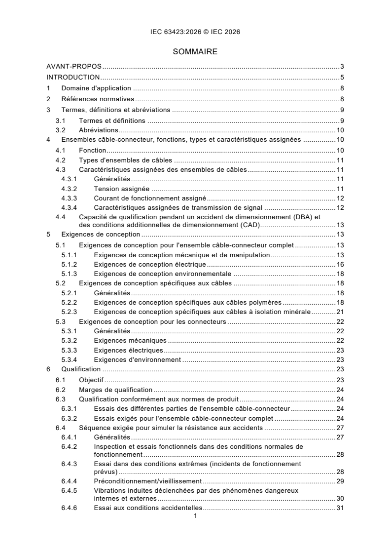 IEC 63423:2026 s'applique aux ensembles câble-connecteur pour utilisation en environnement sévère qui sont importants pour la sûreté. Il couvre les aspects techniques relatifs à la sûreté qui doivent être respectés lors de la conception, la qualification, la fabrication, l'assemblage, les essais et l'installation sur site des ensembles câble-connecteur à utiliser en conditions accidentelles.