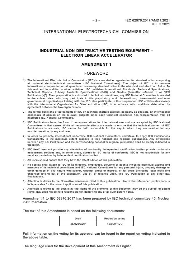 IEC 62976:2017/AMD1:2021 is a standard published by the International Electrotechnical Commission (IEC). Its full title is "Amendment 1 - Industrial non-destructive testing equipment - Electron linear accelerator". This standard covers: Amendment 1 - Industrial non-destructive testing equipment - Electron linear accelerator