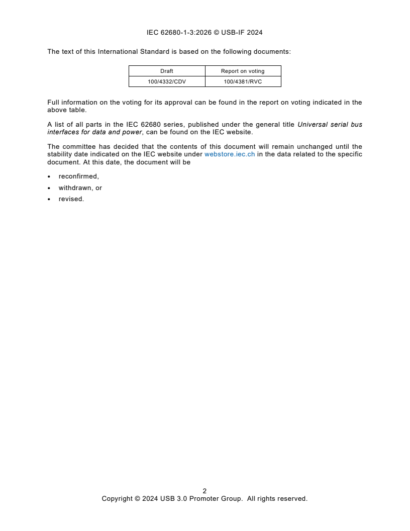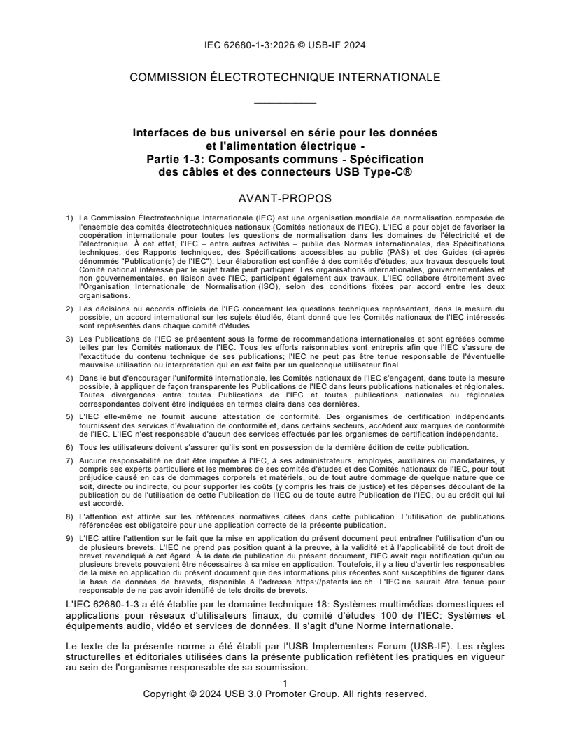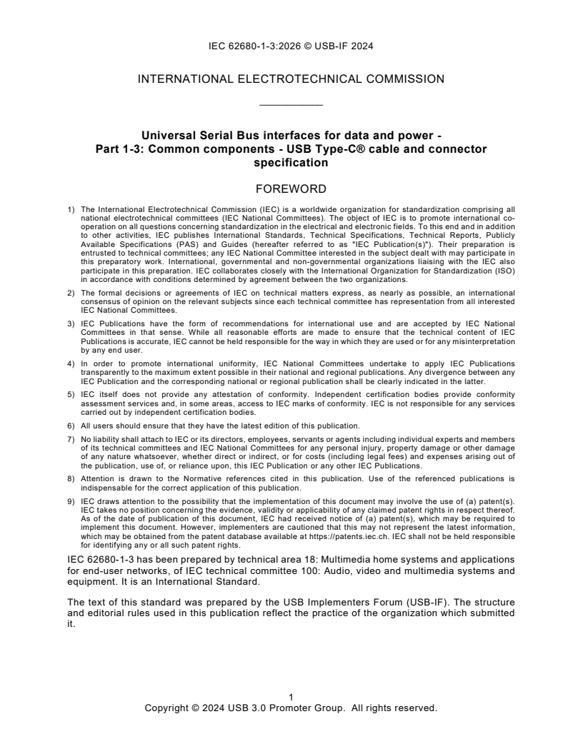 IEC 62680-1-3:2026, this specification, defines the USB Type-C® receptacles, plug and cables. The USB Type-C Cable and Connector Specification is guided by the following principles: - Enable new and exciting host and device form-factors where size, industrial design and style are important parameters - Work seamlessly with existing USB host and device silicon solutions - Enhance ease of use for connecting USB devices with a focus on minimizing user confusion for plug and cable orientation The USB Type-C Cable and Connector Specification defines a receptacle, plug, cable, and detection mechanisms that are compatible with existing USB interface electrical and functional specifications. This specification covers the following aspects that are needed to produce and use this new USB cable/connector solution in newer platforms and devices, and that interoperate with existing platforms and devices: - USB Type-C receptacles, including electro-mechanical definition and performance requirements - USB Type-C plugs and cable assemblies, including electro-mechanical definition and performance requirements - USB Type-C to legacy cable assemblies and adapters - USB Type-C-based device detection and interface configuration, including support for legacy connections - USB Power Delivery optimized for the USB Type-C connector. IEC 62680-1-3:2026 cancels and replaces the sixth edition published in 2024 and constitutes an editorial revision. This standard is the USB-IF publication Universal Serial Bus Type-C Cable and Connector Specification Revision 2.4. New release primarily includes incorporation of all approved ECNs as of the revision date plus editorial clean-up.