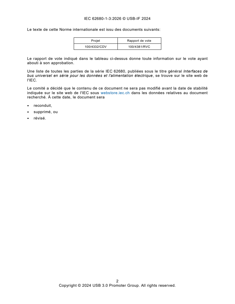 L’IEC 62680-1-3:2026 annule et remplace la sixième édition parue en 2024 et constitue une révision rédactionnelle. Cette norme est la publication de l'USB-IF relative au bus universel en série et à la spécification des câbles et connecteurs de Type-C, révision 2.4. Nouvelle version comprenant l'incorporation de l'ensemble des ECN approuvés à la date de révision, ainsi que les corrections rédactionnelles.