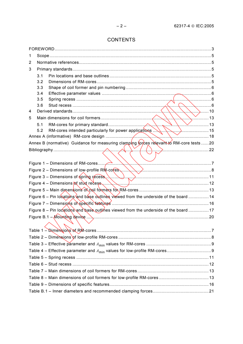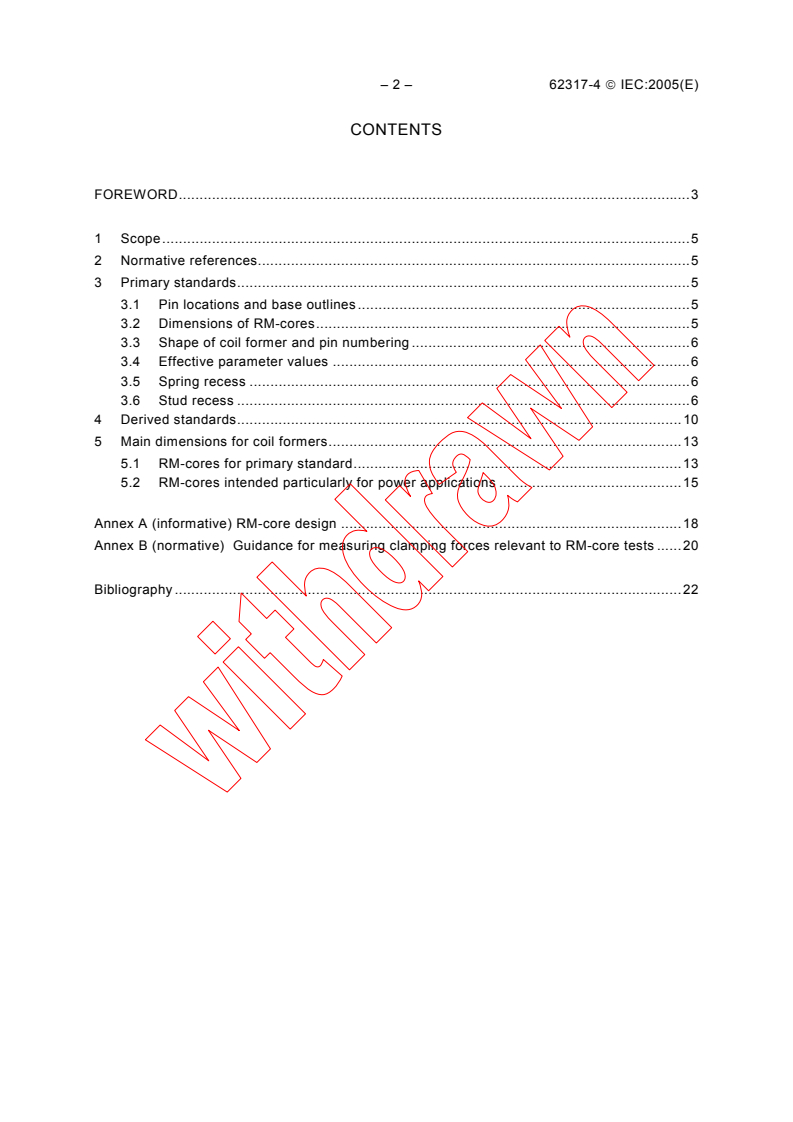 IEC 62317-4:2005 is a standard published by the International Electrotechnical Commission (IEC). Its full title is "Ferrite cores - Dimensions - Part 4: RM-cores and associated parts". This standard covers: IEC 62317-4:2005 specifies the dimensions that are of importance for mechanical interchangeability for a preferred range of RM-cores and low-profile RM-cores made of ferrite, and the locations of their terminal pins on a 2,54 mm printed wiring grid in relation to the base outlines of the cores. It also specifies the test conditions and clamping forces to be used for inductance measurement. This international standard cancels and replaces the second edition of IEC 60431 published in 1983, its amendment 1 (1995), and its amendment 2 (1996). This international standard constitutes a technical revision of IEC 60431. The contents of the corrigendum of July 2016 have been included in this copy.