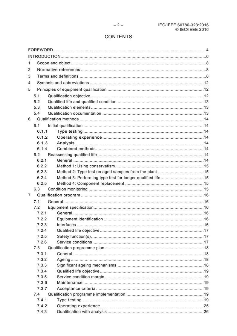 IEC/IEEE 60780-323:2016 is a standard published by the International Electrotechnical Commission (IEC). Its full title is "Nuclear facilities - Electrical equipment important to safety - Qualification". This standard covers: IEC/IEEE 60780-323:2016 describes the basic requirements for qualifying electrical equipment important to safety and interfaces (electrical and mechanical) that are to be used in nuclear facilities. The principles, methods, and procedures described are intended to be used for qualifying equipment, maintaining and extending qualification, and updating qualification, as required, if the equipment is modified. The qualification requirements in this standard, when met, demonstrate and document the ability of equipment to perform safety function(s) under applicable service conditions, including design basis events and certain design extension conditions, and reduce the risk of environmentally induced common-cause equipment failure. This new edition includes the following main changes with respect to the previous edition IEC 60780:1998 harmonizes in a unique standard qualification practices formerly given by IEC 60780:1998 and IEEE 323:2003 on initial qualification, takes into account the need to reassess and extend the qualified life of electrical equipment regarding projects to extend the operating life of nuclear facilities.