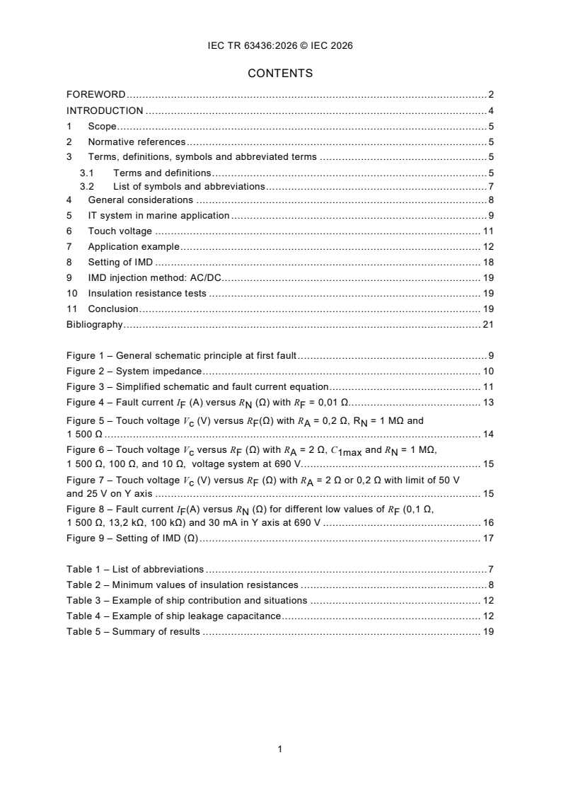 IEC TR 63436:2026 is a technical report published by the International Electrotechnical Commission (IEC). Its full title is "Insulation monitoring device - Marine AC application example". This standard covers: IEC TR 63436:2026 explains the setting parameters of insulation monitoring devices (IMDs) and how to interpret these measurements through plotted curves. Some examples of injection methods are also proposed. The examples given in this document consider the situation of an insulation fault in an installation or equipment (motors, enclosure, cables, etc.) creating a resistive path to earth and calculate the touch voltage. It does not consider a person making direct contact with a live conductor in an IT grid.