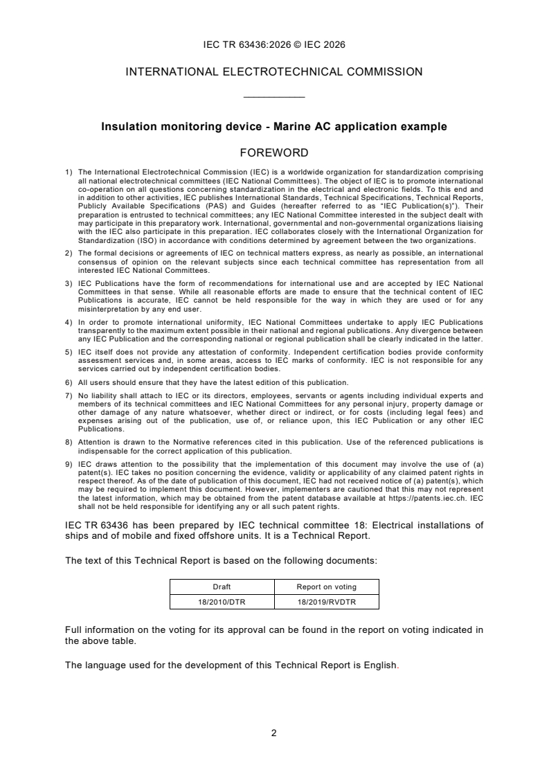 IEC TR 63436:2026 is a technical report published by the International Electrotechnical Commission (IEC) that provides guidance on insulation monitoring devices (IMDs) in marine AC applications. This standard specifically focuses on setting the parameters for IMDs, interpreting insulation resistance measurements, and demonstrating examples of injection methods used to test insulation integrity. It addresses how to assess insulation faults in marine electrical installations such as motors, enclosures, and cables, and calculates the resulting touch voltage to improve operational safety in IT electrical systems onboard ships.