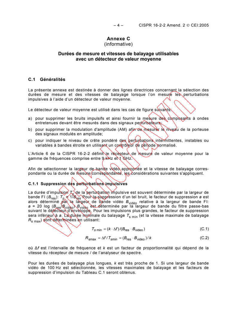 This amendment to CISPR 16-2-2 is intended to give guidance on the selection of scan rates and measurement times when measuring impulsive disturbance with the average detector.
