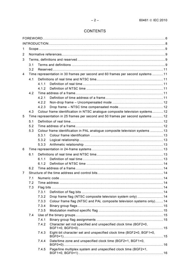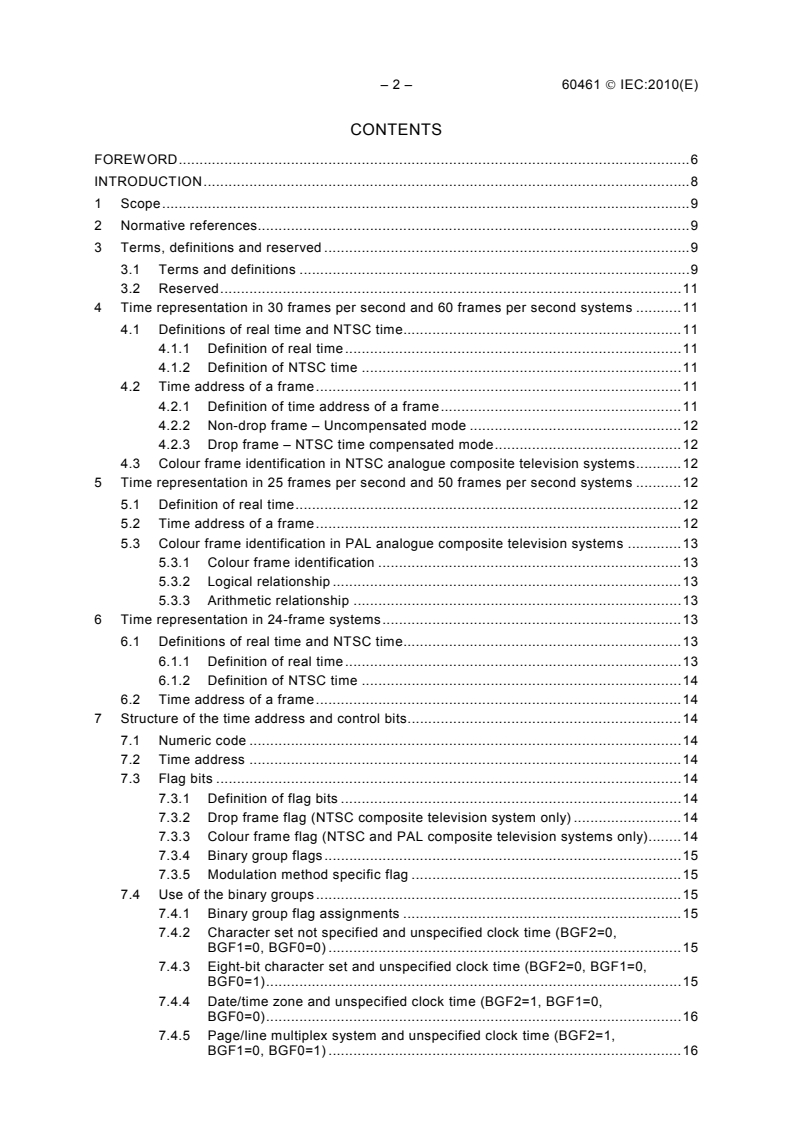 IEC 60461:2010 - Time and control code is the international IEC standard that defines a digital time and control code (timecode) for television, film and associated audio systems. It specifies the structure and transport of frame-accurate time addresses, flag bits and binary groups for use across common nominal frame rates (60, 59.94, 50, 30, 29.97, 25, 24, 23.98, 59.94/50 progressive, etc.). The 2010 edition (Edition 4.0) cancels and replaces the 2001 edition and adds support for progressive systems with frame rates greater than 30 fps. A bilingual (2012) release corresponds to the 2010 English version.