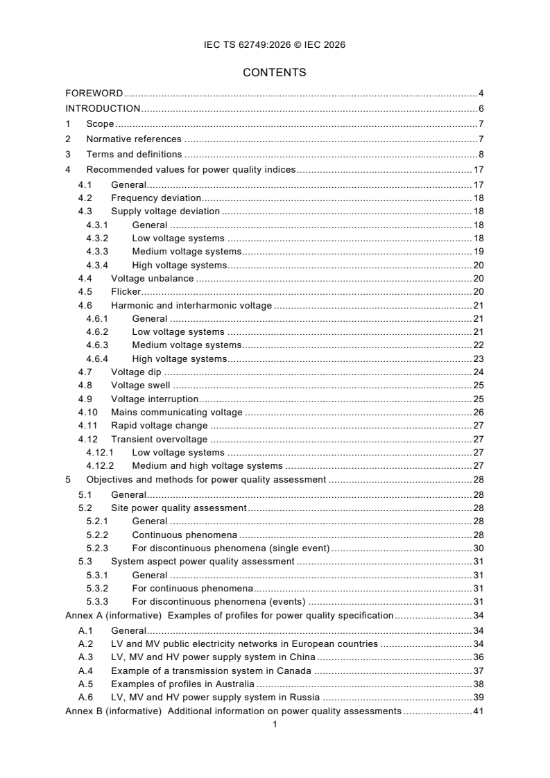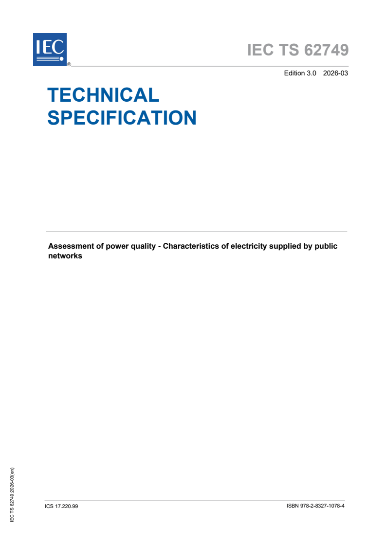 IEC TS 62749:2026 specifies the expected characteristics of electricity at the point of supply of public low, medium and high voltage, 50 Hz or 60 Hz, networks, as well as power quality assessment methods. This document does not apply for systems operated above 230 kV.