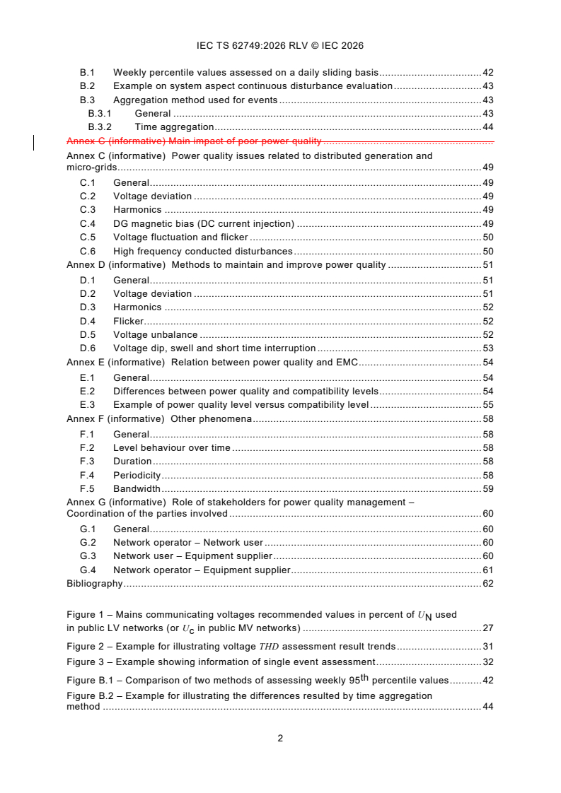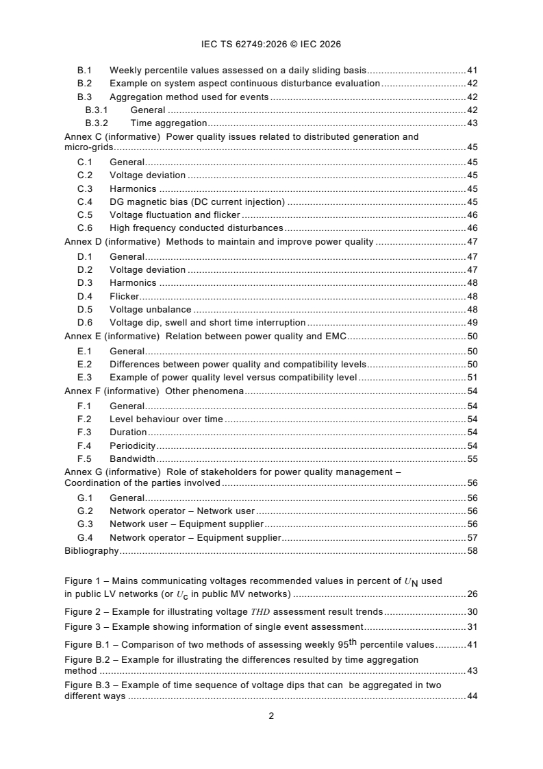 IEC TS 62749:2026 is a technical specification published by the International Electrotechnical Commission (IEC). Its full title is "Assessment of power quality - Characteristics of electricity supplied by public networks". This standard covers: IEC TS 62749:2026 specifies the expected characteristics of electricity at the point of supply of public low, medium and high voltage, 50 Hz or 60 Hz, networks, as well as power quality assessment methods. This document does not apply for systems operated above 230 kV. The boundaries between the various voltage levels can be different for different countries or regions. In the context of this document, the following terms for system voltage are used: - low voltage (LV) refers to UN ≤ 1 kV; - medium voltage (MV) refers to 1 kV - high voltage (HV) refers to 35 kV Because of existing network structures, in some countries or regions, the boundary between medium and high voltage can be different. While power quality is related to EMC in a number of ways, especially because compliance with power quality requirements depends on the control of cumulative effect of electromagnetic emission from all or multiple equipment and installations, this document is not an EMC publication (see also Annex E). This third edition cancels and replaces the second edition published in 2020. This edition includes the following significant technical changes with respect to the previous edition: - clarification that harmonic orders recommended in this document are up to 40th; - 4.6 is modified accordingly; - iteration that this document does not apply for systems operated above 230 kV; - deletion of Annex C; - improvement of 4.10; - update of profiles and addition of new profiles; - modifications to align with EN 50160:2022 and EN 50160:2022/AMD1:2025.