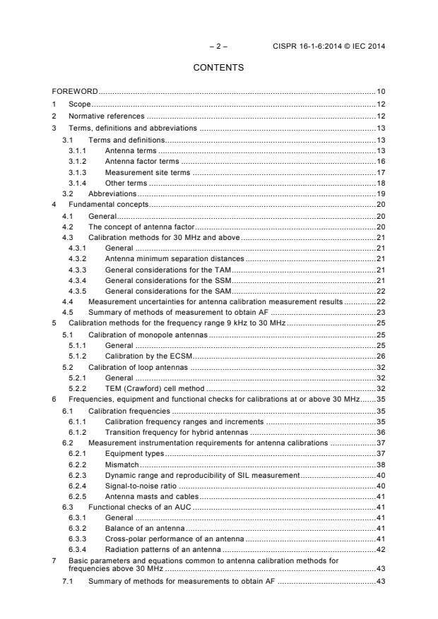 CISPR 16-1-6:2014 provides procedures and supporting information for the calibration of antennas for determining antenna factors (AF) that are applicable to antennas intended for use in radiated disturbance measurements. It has the status of a basic EMC Standard in accordance with IEC Guide 107, Electromagnetic compatibility. The AF of an antenna is influenced by nearby surroundings and by its position in space relative to the radiating source. This standard focuses on antenna calibrations that provide the AF in a free-space environment in the direction of the boresight of the antenna. The frequency range addressed is 9 kHz to 18 GHz. The relevant antenna types covered in this standard are monopole, loop, dipole, biconical, log-periodic dipole-array (LPDA), hybrid and horn antennas. Guidance is also provided on measurement uncertainties associated with each calibration method and configuration, and the test instrumentation used.