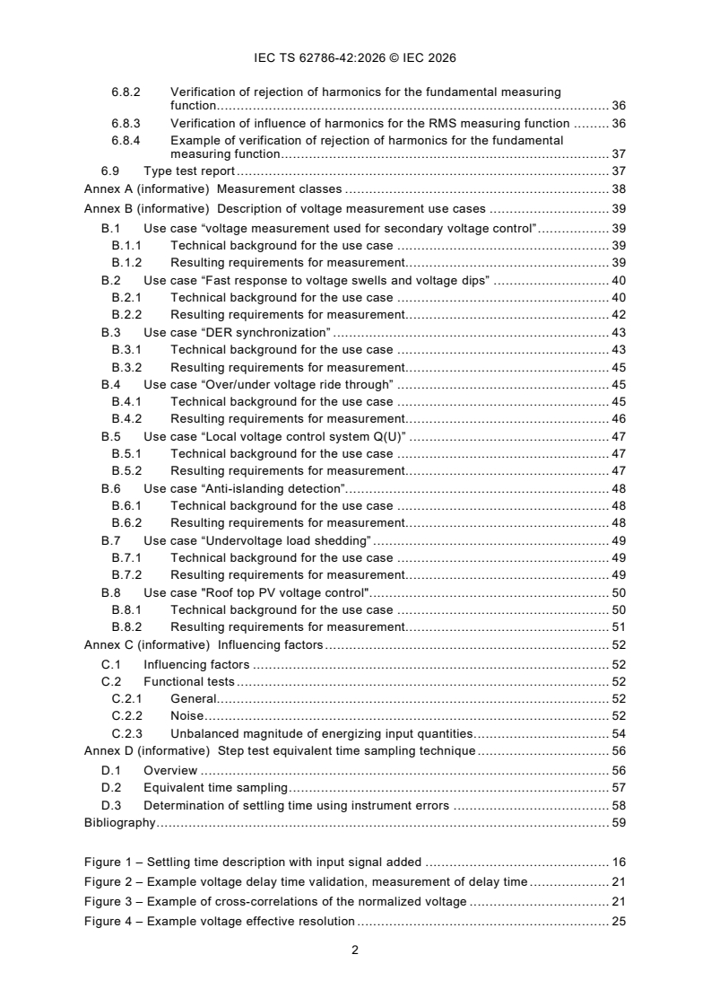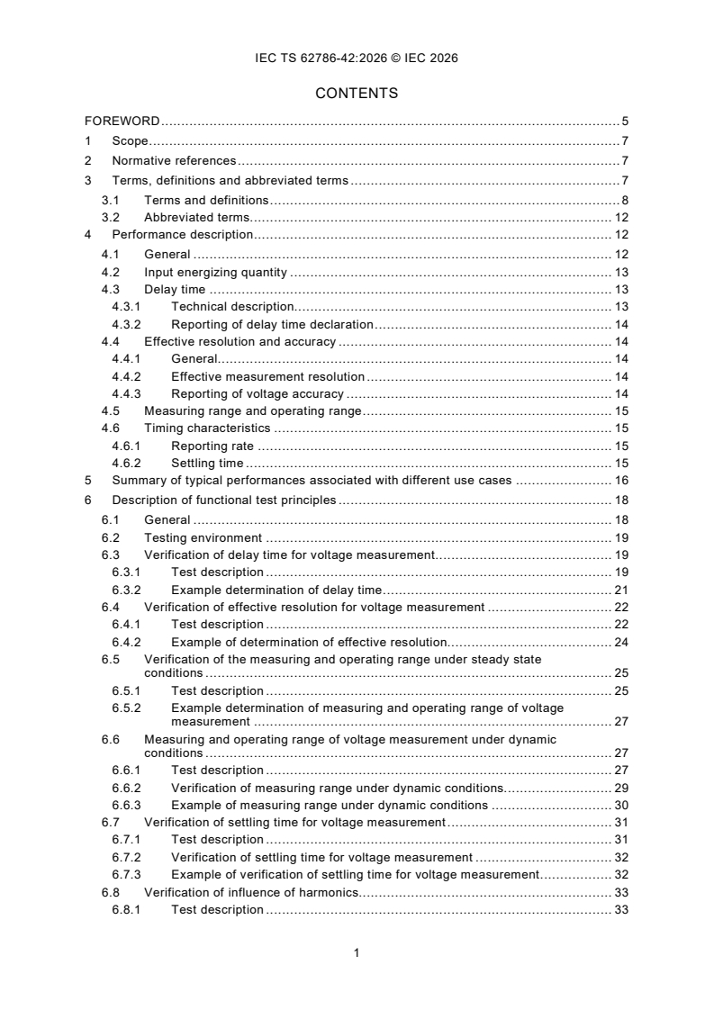 IEC TS 62786-42:2026 defines minimum requirements for AC voltage measurement used to control distributed energy resources (DER) and loads connected to distribution networks. This document specifies the characteristics of voltage magnitude measurement to evaluate their performances (including voltage and frequency measuring range, accuracy, voltage and frequency operating range, resolution, etc). This document describes the main use cases of voltage measurement, with associated level of performances. This document describes the principle of functional tests to evaluate the specified characteristics and defines the influencing factors that affect these performances, under steady state or dynamic conditions. This document defines the functional requirements applicable to voltage measurement which can be embedded inside DER or loads controller or performed as an external control system. In the case of DER, this document is a subpart of requirements which are defined in the other parts of the IEC 62786 series. This document is applicable to DER and loads regardless of voltage level at the point of connection to the distribution grid. This document does not specify hardware, software or a method for voltage measurement. It does not specify tests linked to environmental conditions associated to hardware devices (climatic, mechanical stress, electromagnetic compatibility test, etc).