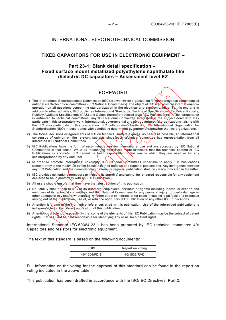 IEC 60384-23-1:2005 is a standard published by the International Electrotechnical Commission (IEC). Its full title is "Fixed capacitors for use in electronic equipment - Part 23-1: Blank detail specification - Fixed surface mount metallized polyethylene naphthalate film dielectric DC capacitors - Assessment level EZ". This standard covers: supplementary document to the sectional specification and contains requirements for style, layout and minimum content of detail specifications. Detail specifications not complying with these requirements may not be considered as being in accordance with IEC specifications nor shall they so be described.