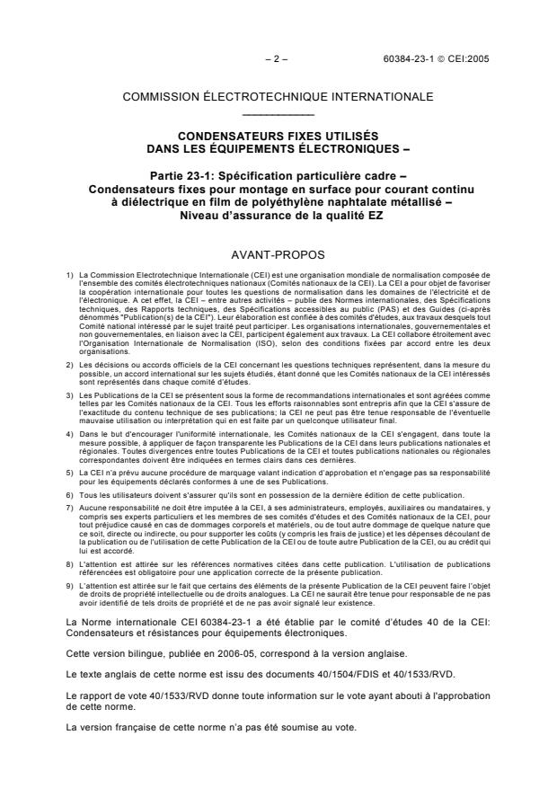 IEC 60384-23-1:2005 - Fixed capacitors for use in electronic equipment - Part 23-1: Blank detail specification - Fixed surface mount metallized polyethylene naphthalate film dielectric DC capacitors - Assessment level EZ