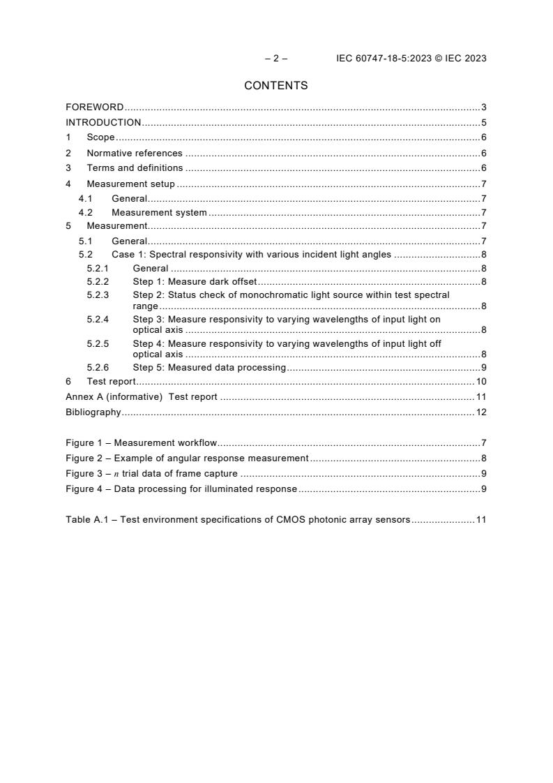 IEC 60747-18-5:2023 - "Semiconductor devices - Part 18-5: Semiconductor bio sensors - Evaluation method for light responsivity characteristics of lens-free CMOS photonic array sensor package modules by incident angle of light" - specifies a standardized test method to evaluate how lens-free CMOS photonic array sensor package modules respond to light arriving at different angles and wavelengths. The standard defines the measurement setup, stepwise test procedure, required test items and the content of the test report to ensure reproducible, comparable spectral angular responsivity data.