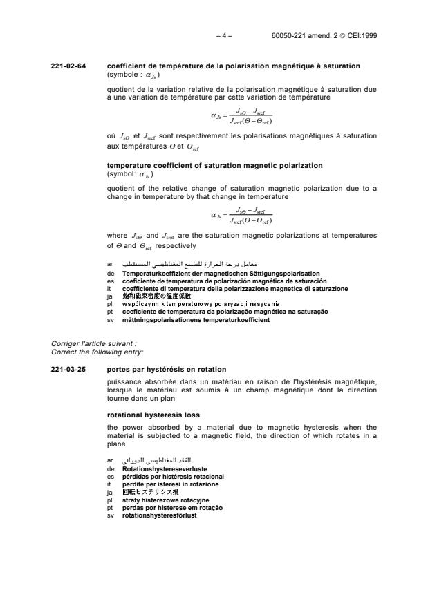 Keywords: IEC 60050-221 Amendment 2, International Electrotechnical Vocabulary, magnetic materials, magnetic components, saturation magnetization temperature coefficient, magnetic polarization temperature coefficient, rotational hysteresis loss, rotational power loss, magnetic alloys, ferrite materials, electrotechnical terminology, IEC standards