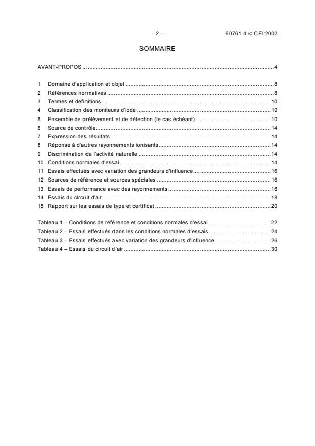 IEC 60761-4:2002 is an international standard developed by the International Electrotechnical Commission (IEC) that specifies specific technical requirements for equipment designed to continuously monitor radioactive iodine in gaseous effluents. This standard forms Part 4 of the IEC 60761 series, which covers equipment for continuous monitoring of radioactivity in gaseous emissions. It addresses the particular needs for radioactive iodine monitors, including measurable parameters, performance conditions, and methods for data expression and alarm triggering.