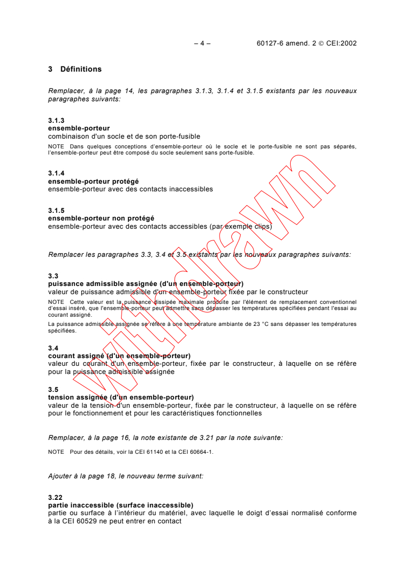 The amendment updates key definitions such as fuse-holder (combination of fuse-base and fuse-carrier), protected and unprotected fuse-holders (contacts enclosed vs. accessible), rated power acceptance, rated current, and rated voltage. These precise terms clarify requirements for design and safety assessment.Preferred Ratings and Classifications