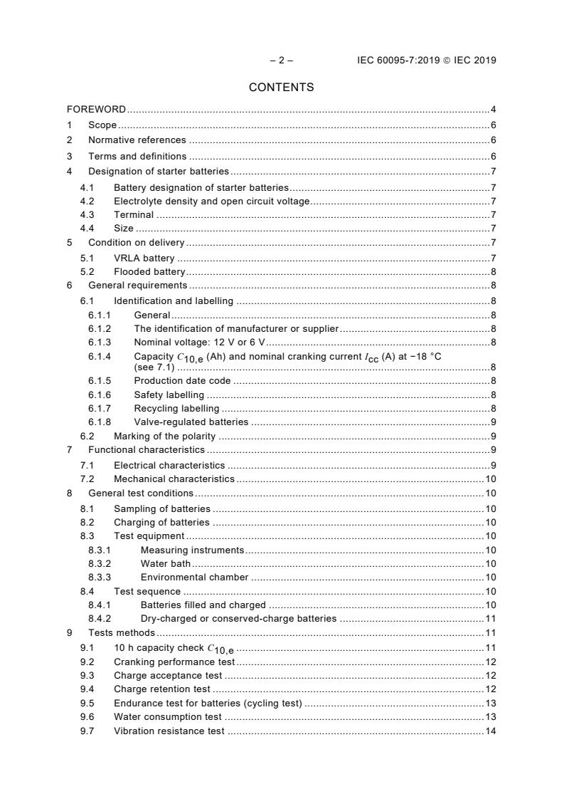 IEC 60095-7:2019 is an international standard developed by the International Electrotechnical Commission (IEC) that specifies the general requirements and test methods for lead-acid starter batteries used in motorcycles and other power sport vehicles. This standard focuses on lead-acid batteries primarily intended as power sources for starting internal combustion engines, as well as for lighting and ignition (SLI systems). It covers nominal battery voltages of 12 V and 6 V and includes vehicles such as motorcycles, snowmobiles, personal water crafts, and all-terrain vehicles (ATVs).