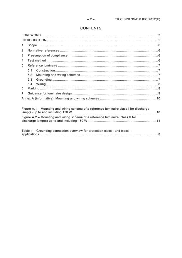 CISPR/TR 30-2:2012(E), which is a technical report, details with the aid of reference luminaires, an independent method by which the radio disturbance characteristics of built-in electronic control gear for discharge (excluding fluorescent) lamp luminaires with protection classes I and/or II may be compared against the requirements of CISPR 15. The scope of the part is limited to electronic lamp control gear with an output power (lamp power) up to and including 150 W. Independent electronic lamp control gears are not covered by this technical report; they are within the scope of CISPR 15. This first edition of CISPR/TR 30-2 is published in conjunction with CISPR/TR 30-1. Each part of CISPR 30 series is independent and describes the test set-up for electronic control gear use together with a special lamp family.