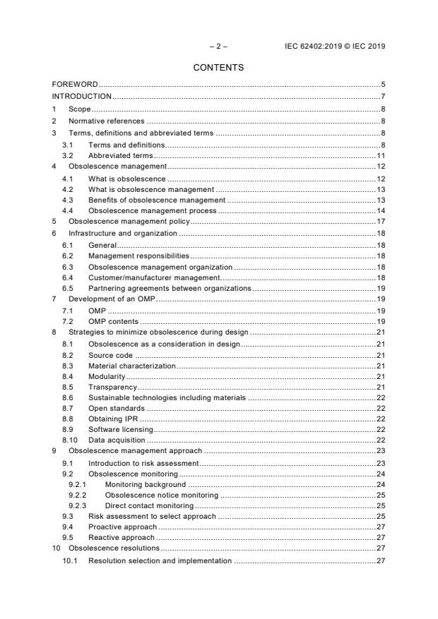 IEC 62402:2019 is a standard published by the International Electrotechnical Commission (IEC). Its full title is "Obsolescence management". This standard covers: IEC 62402:2019 provides requirements and guidance for obsolescence management applicable to any organization that is dependent on another organization to obtain value from the usefulness of the items that it provides. A cost-effective obsolescence management process and the activities used to implement the process are applicable throughout all phases of an item’s life cycle. This document covers the following areas: • establishing an obsolescence management policy; • establishing an infrastructure and an organization; • developing an obsolescence management plan (OMP); • developing strategies to minimize obsolescence during design; • determining an obsolescence management approach; • selecting obsolescence resolution and implementation; • measuring and improving the performance of the outcomes of the obsolescence management activities. Guidance on obsolescence management is included as notes, in the informative annexes and references in the Bibliography. This second edition cancels and replaces the first edition published in 2007. This edition constitutes a technical revision. This edition includes the following significant technical changes with respect to the previous edition: a) this document has now been written with requirements as a standard, not a guide; b) this document continues to have guidance in the informative annexes; c) this document has been written as a general process for all technologies and items. Keywords: obsolescence management