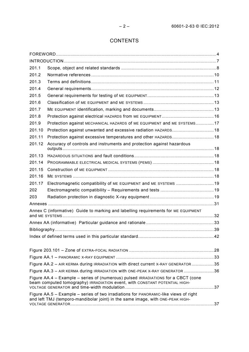 IEC 60601-2-63:2012 is a standard published by the International Electrotechnical Commission (IEC). Its full title is "Medical electrical equipment - Part 2-63: Particular requirements for the basic safety and essential performance of dental extra-oral X-ray equipment". This standard covers: IEC 60601-2-63:2012 applies to the basic safety and essential performance of dental extra-oral X-ray equipment, hereafter also called ME equipment. The scope includes ME systems containing such ME equipment. This particular standard has been prepared to provide, based on IEC 60601-1:2005 and its collaterals, a complete set of basic safety and essential performance requirements for dental extra-oral x-ray equipment. While the previously existing standards for such equipment were dedicated to components and subsystems, this particular standard addresses the system level of dental extra-oral x-ray equipment. Components and their functions are addressed as far as necessary. The scope of this standard is restricted to X-ray equipment where: - the x-ray tube assembly contains the high-voltage transformer assembly; and - the geometrical relations between the X-ray source, the anatomical object being imaged in the patient, and the X-ray image receptor, are preset in the design and cannot be arbitrarily altered by the operator during intended use.