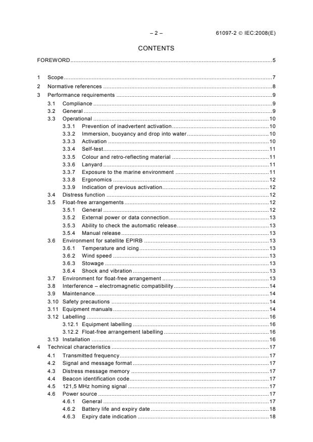 IEC 61097-2:2008 is a standard published by the International Electrotechnical Commission (IEC). Its full title is "Global maritime distress and safety system (GMDSS) - Part 2: COSPAS-SARSAT EPIRB - Satellite emergency position indicating radio beacon operating on 406 MHz - Operational and performance requirements, methods of testing and required test results". This standard covers: Specifies the minimum performance requirements, technical characteristics and type-testing requirements of the satellite emergency position-indicating radio beacon used in the COSPAS-SARSAT satellite system (satellite EPIRB), as required by the International Convention for Safety of Life at Sea (SOLAS). Is associated with IEC 60945 and incorporates the performance standards of the relevant IMO Resolutions and ITU Regulations. Significant changes in this third edition include revised characteristics for the low duty cycle light, together with a revised test to allow the use of white LEDs. Other requirements have been clarified or revised as well.