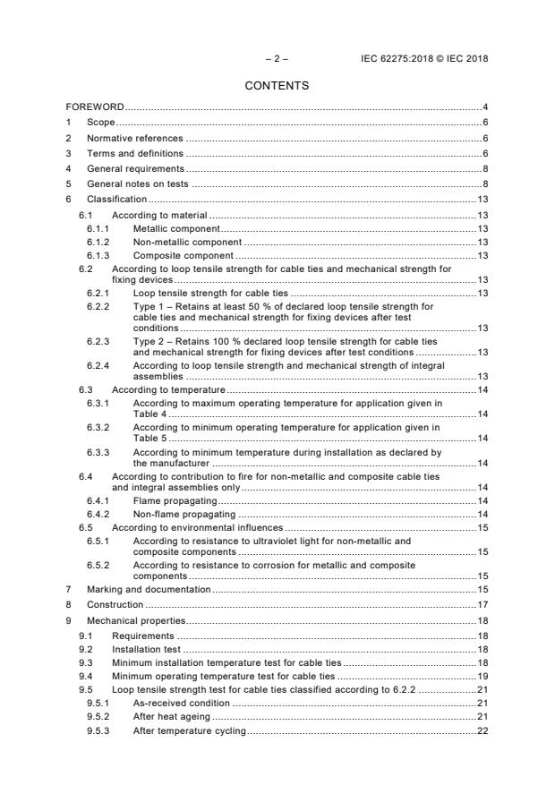 IEC 62275:2018 specifies requirements for metallic, non-metallic and composite cable ties and their associated fixing devices used for the management and support of wiring systems in electrical installations. This third edition cancels and replaces the second edition published in 2013. This edition constitutes a technical revision. This edition includes the following significant technical changes with respect to the previous edition: a) consideration of adhesive fixing devices, b) revised and updated normative references, c) modified definitions for metallic and composite cable ties, d) new definitions, e) improvement of test procedures, f) new figures for typical arrangement of test assembly for fixing devices and for integral fixing devices.