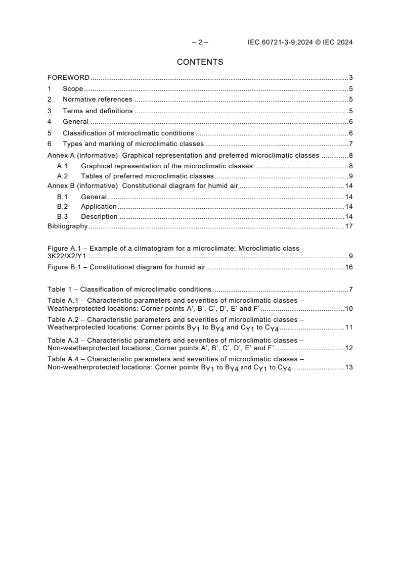 IEC 60721-3-9:2024 is a standard published by the International Electrotechnical Commission (IEC). Its full title is "Classification of environmental conditions - Part 3-9: Classification of groups of environmental parameters and their severities - Microclimates inside products". This standard covers: IEC 60721-3-9:2024 classifies groups of microclimatic conditions, to which components (basic parts, assemblies, built-in units) can be subjected inside products, which are used under the climatic conditions as classified in IEC 60721-3-3 and IEC 60721-3-4. This second edition cancels and replaces the first edition published in 1993, Amendment 1:1994 and Corrigendum 1:1995. This edition constitutes a technical revision. This edition includes the following significant technical changes with respect to the previous edition: a) Clause 2 has been updated; b) Clause 4 has been re-edited and simplified; c) Annex A has been revised and updated; d) a new Annex B has been added and gives the origin of the constitutional diagram for humid air, which is the basis of drawing the climatogram for a microclimate.