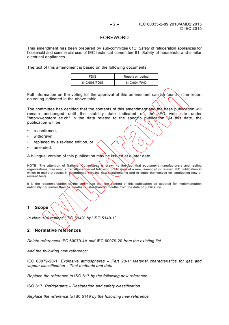 IEC 60335-2-89:2010/AMD2:2015 - Amendment 2 - Household and similar electrical appliances - Safety - Part 2-89: Particular requirements for commercial refrigerating appliances with an incorporated or remote refrigerant unit or compressor Released:9/9/2019 Isbn:9782832271520