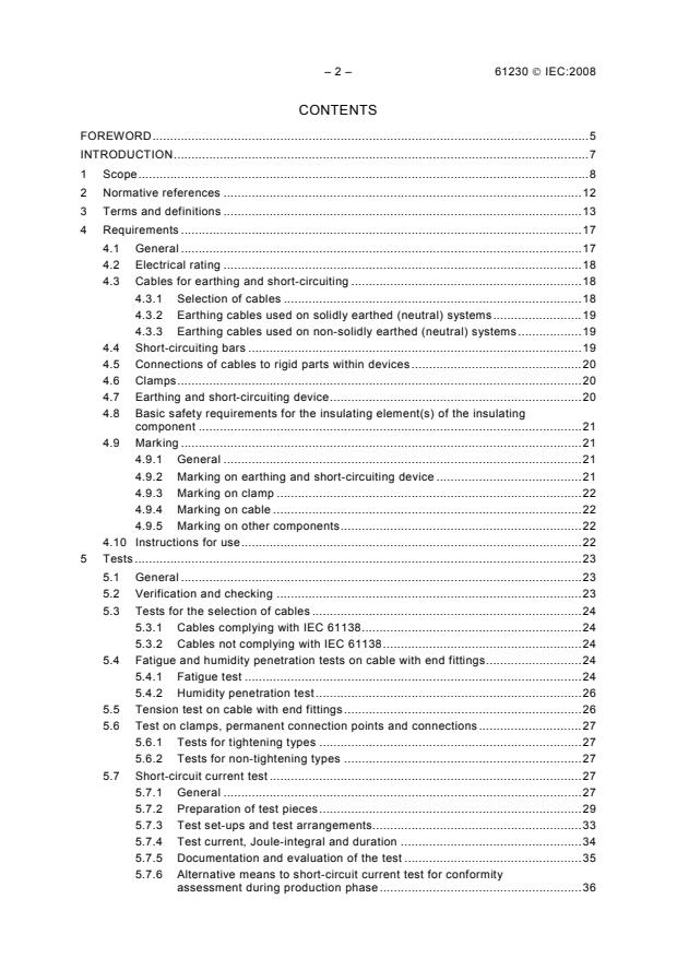 IEC 61230:2008 is a standard published by the International Electrotechnical Commission (IEC). Its full title is "Live working - Portable equipment for earthing or earthing and short-circuiting". This standard covers: IEC 61230:2008 is applicable to portable equipment, with or without matching connection points, for temporary earthing or earthing and short-circuiting of electrically isolated or de-energized a.c. and d.c. installations, distribution and transmission networks, whether they are overhead or underground or of low or high voltage. This standard covers equipment comprising an earthing or a short-circuiting or an earthing and short-circuiting device and insulating component. The performance of equipment, devices and components covered by this standard is based on electro-dynamic and electro-thermal effects acting during short-circuit. The withstand capability of the devices and equipment is expressed by their rated values of current, time and peak factor. No rated voltage is given, but the geometrical dimensions of the equipment are also linked to the voltage of the installation. This second edition cancels and replaces the first edition published in 1993. It constitutes a technical revision. The major changes are: - extension of the scope to cover the use of equipment on d.c. installations; - extension of the use of aluminium to all conductive parts of the device; - possibility of using this standard for separate components of the equipment; - general revision of requirements and tests; - revision of existing annexes; - introduction of a new informative Annex D giving guidelines for determination of the equivalent r.m.s. value of a short-circuit current and of a new normative Annex F on classification of defects.