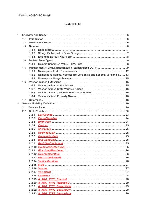 ISO/IEC 29341-4-13:2011 - Information technology - UPnP Device Architecture - Part 4-13: Audio Video Device Control Protocol - Level 2 - Rendering Control Service defines the UPnP RenderingControl service for audio/video renderers. It specifies how a UPnP control point can discover, query, change and restore rendering attributes supported by a device (for example brightness, contrast, volume, mute, color temperature and keystone). This second-edition standard is compliant with Universal Plug and Play Device Architecture v1.0 and replaces the 2008 first edition.