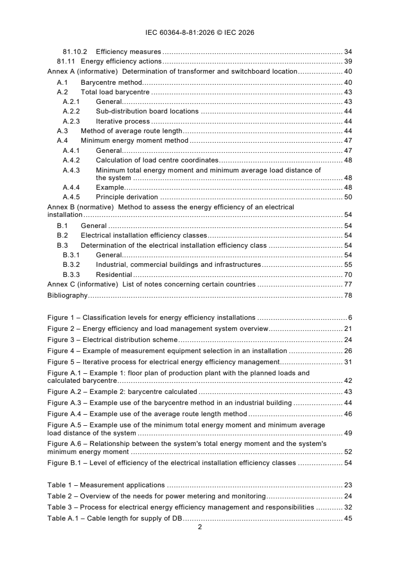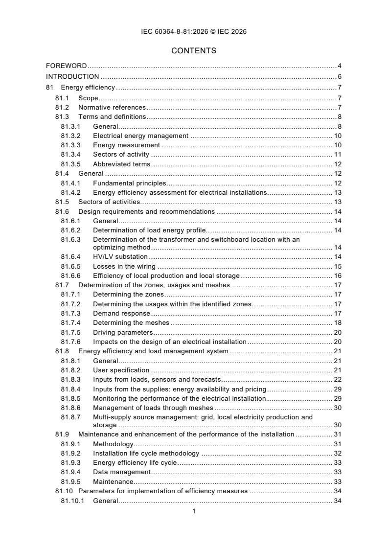 IEC 60364-8-81:2026 provides additional requirements, measures and recommendations for the design, erection, operation and verification of all types of low-voltage electrical installation including local production and storage of energy for optimizing the overall efficient use of electricity. It introduces requirements, recommendations and methods for the design and the energy efficiency (EE) assessment of an electrical installation within the framework of an energy efficiency management approach in order to get the best permanent functionally equivalent service for the lowest electrical energy consumption and the optimal availability and acceptable cost-effectiveness. These requirements, recommendations and methods apply, within the scope of the IEC 60364 series, for new installations and modification of existing installations. This document is applicable to the electrical installation of a building or system and does not apply to products. The energy efficiency of products and their operational requirements are covered by the relevant product standards. It is possible that another standard provides specific requirements for a particular system or installation application (e.g. manufacturing system covered by ISO 20140 series). This document does not specifically provide requirements for building automation systems. The contribution of building automation systems to improve energy efficiency of the installation is considered. This group energy efficiency publication is primarily intended to be used as an energy efficiency standard for the low-voltage electrical installations mentioned in the scope, but is also intended to be used by technical committees in the preparation of publications, in accordance with the principles laid down in IEC Guide 118 This first edition cancels and replaces the second edition of IEC 60364-8-1 published in 2019. This edition constitutes a technical revision. This edition includes the following significant technical changes with respect to the previous edition: a) modified numbering that allows IEC 60364-7 subparts to amend this document; b) alignment of the definitions with IEC 60050-826; c) introduction of minimum energy moment method in Annex A; d) improvements in Annex B