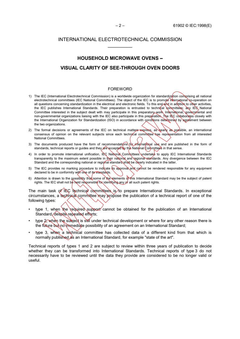 IEC TS 61902:1998 is a technical specification published by the International Electrotechnical Commission (IEC). Its full title is "Household microwave ovens - Visual clarity of see-through oven doors". This standard covers: The technical report specifies the characteristics of the visual clarity of see-through microwave oven doors. The tests may also be applicable to cooking ranges and other appliances where the workload is enclosed but visible.