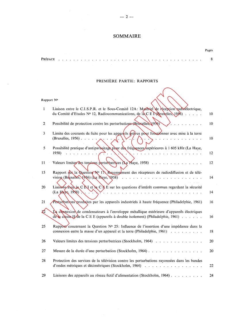Rapports et Questions à l'étude du CISPR (approuvés ou confirmés lors de la Réunion plénière du CISPR à Stockholm en 1964)